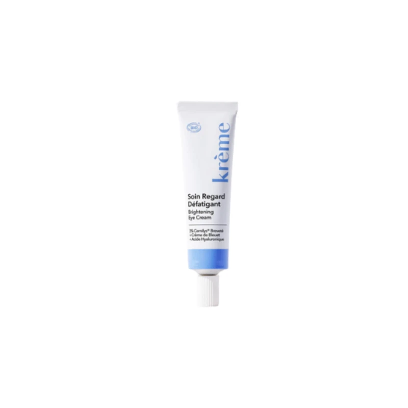 Krème a élaboré le Soin Regard Défatigant Bio anticernes et antipoches pour atténuer les cernes et les poches, lisser la peau et l’hydrater. Il est formulé sans parfum et il est hypoallergénique. Il combine 3% de Cernilys® breveté issu du bleuet français de l’Aude et de l’acide hyaluronique tout droit venu de Bretagne agissant sur les 3 principales actions recherchées : les poches, les cernes et les rides.